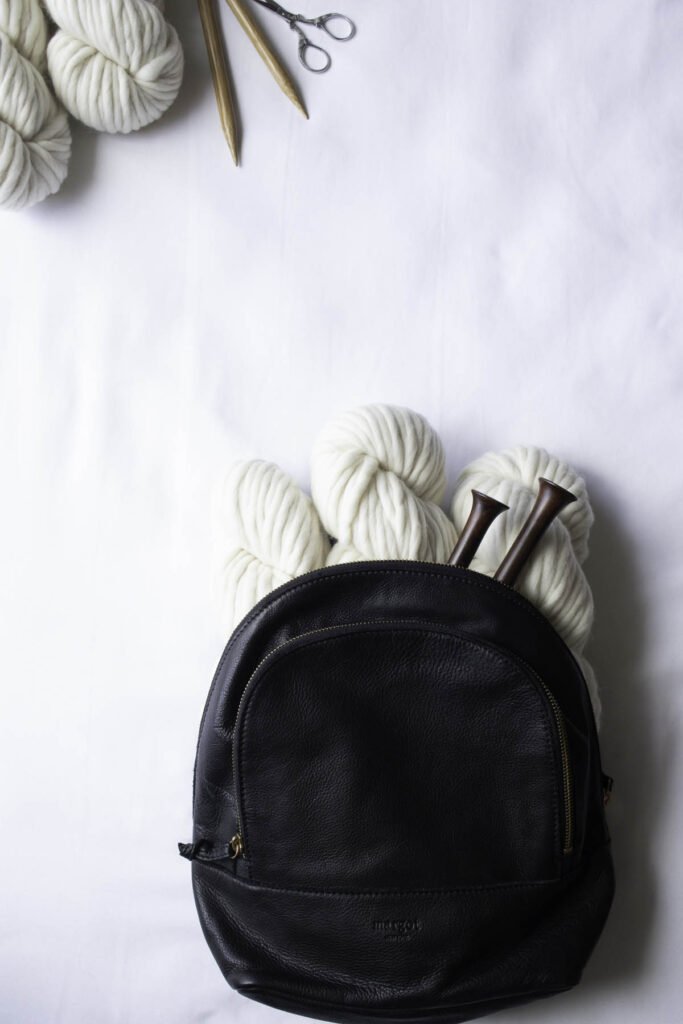 Thereโs something about a black leather knitting bag that just feels elevated โ a little mysterious, a little timeless, and completely practical. This one has quickly become my go-to for late nights out with the ladies, when Iโm wearing all black and feeling elegant but still want to sneak in a few quiet stitches before, during and after the conversation.